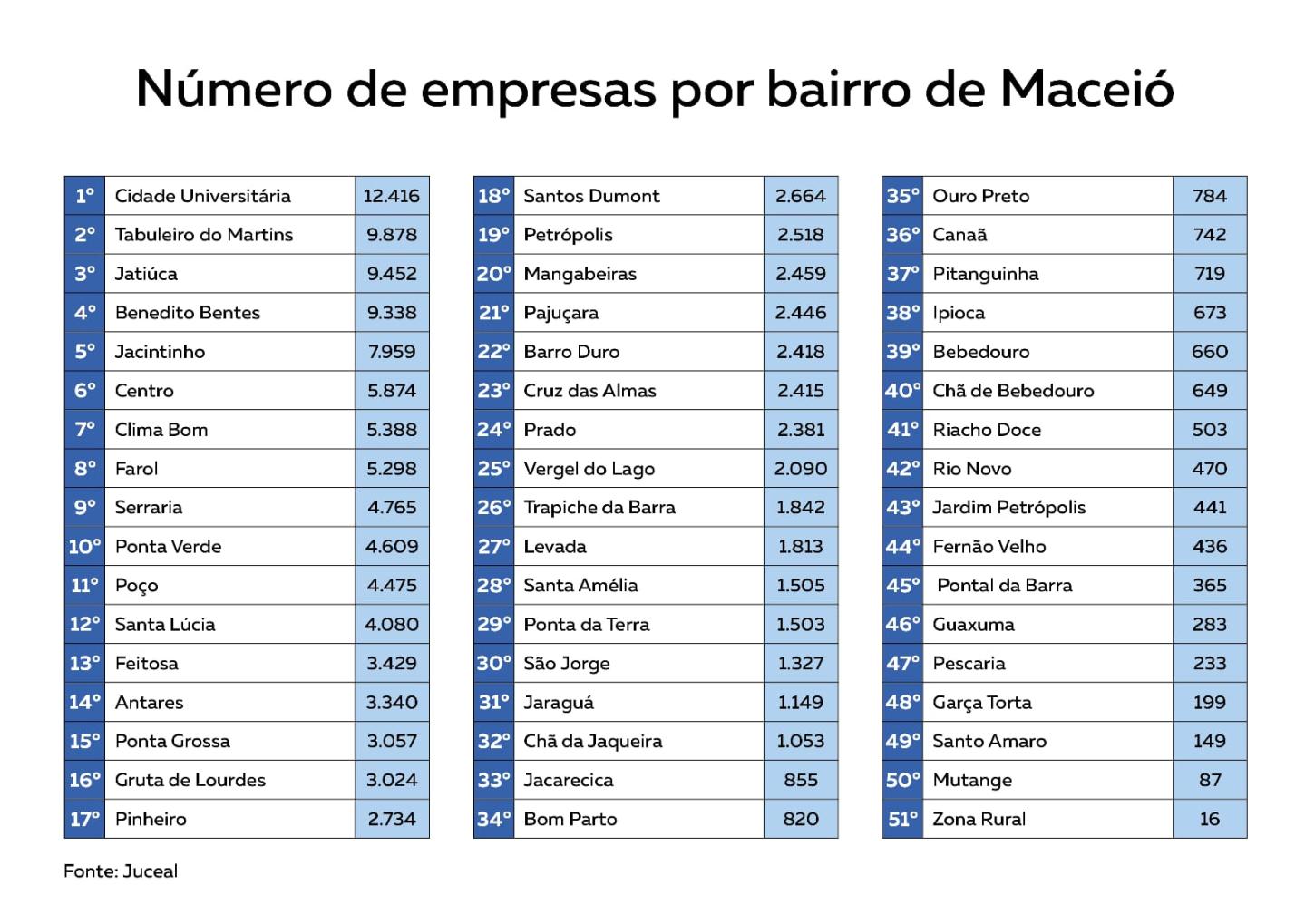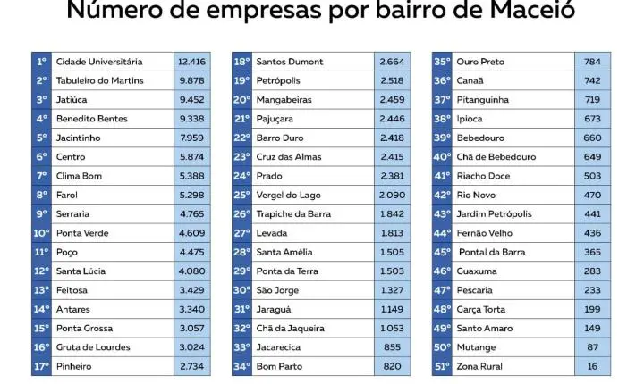 O total de empresas registradas em Maceió alcança 137.815, distribuídas de maneira desigual por diferentes bairros. Após a Cidade Universitária, os bairros com maior número de empreendimentos são Tabuleiro do Martins (9.878), Jatiúca (9.452) e Benedito Bentes (9.338), com destaque também para o Jacintinho (7.959) e o Centro (5.874), que demonstram grande dinamismo econômico.