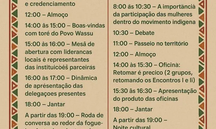 O evento acontece de 24 a 26 de outubro, na Aldeia Indígena Wassu-Cocal, em Joaquim Gomes, Alagoas, com o tema “Mulheres Indígenas: defensoras dos corpos-territórios”. Reunindo lideranças dos dois estados, o encontro fortalece o movimento indígena e suas pautas territoriais, culturais e sociais.